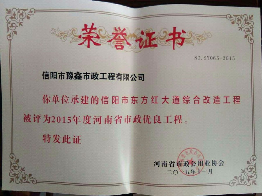 好風(fēng)憑借力,送我上青云。近年來,公司積極參與城市市政基礎(chǔ)設(shè)施建設(shè)施工,積極參與市場競爭,先后承擔(dān)施工了市政府重點(diǎn)工程南京路道路改造工程、春曉路道路改造工程,東方紅大道道路改造工程、龍江東路新建工程等重點(diǎn)民生工程,其中南京路道路改造工程被省建設(shè)廳評為“中州杯”, 春曉路和東方紅大道道路改造工程被省建設(shè)廳評為“省優(yōu)工程”,成為城區(qū)一道道亮麗的風(fēng)景線。參與施工了市典范小區(qū)“臺北城上城”、“恒大名都”以及師范學(xué)院、職業(yè)技術(shù)學(xué)院、交警支隊(duì)和軍區(qū)道路工程,參與施工了雞公山管理區(qū)、南灣管理區(qū)、明港鎮(zhèn)和羅山縣等部分道路小區(qū)工程施工,累計(jì)大小各類施工工程三百余項(xiàng),企業(yè)影響力不斷擴(kuò)大、輻射力不斷增強(qiáng),市場份額不斷提高,企業(yè)信譽(yù)不斷彰顯,為信陽城市建設(shè)做出了積極貢獻(xiàn),為企業(yè)的可持續(xù)發(fā)展插上了騰飛的翅膀。
